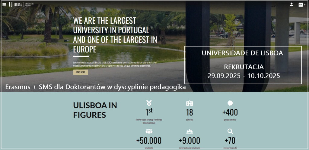 Trwa rekrutacja dla Doktorantów Szkoły Doktorskiej UKSW w dyscyplinie pedagogika na wyjazd do Portugalii, na Uniwersytet Lizboński (https://www.ulisboa.pt/en) w celu realizacji części toku studiów w roku akademickim 2025/2026 w ramach programu Erasmus+.