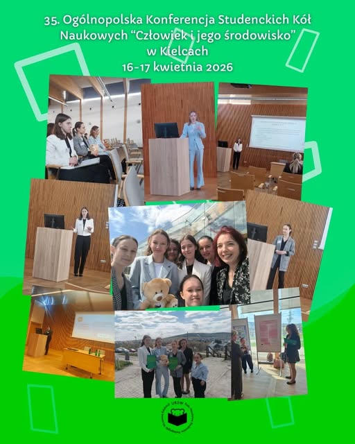 W dniach 16 i 17 kwietnia br. sześcioro członków Naszego Koła wzięło udział w 35. Ogólnopolskiej Konferencji Studenckich Kół Naukowych „Człowiek i jego środowisko” zorganizowanej przez Uniwersytet Jana Kochanowskiego w Kielcach.