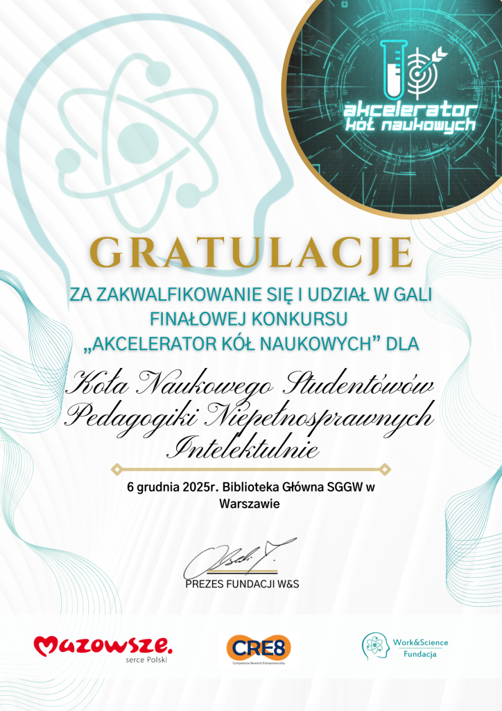 Koło Naukowe Studentów Pedagogiki Niepełnosprawnych Intelektualnie znalazło się w gronie 10 Kół Naukowych zakwalifikowanych do etapu finałowego Konkursu „Akcelerator Kół Naukowych” organizowanego przez Fundację Work & Science oraz Fundację Competences · Research · Entrepreneurship.