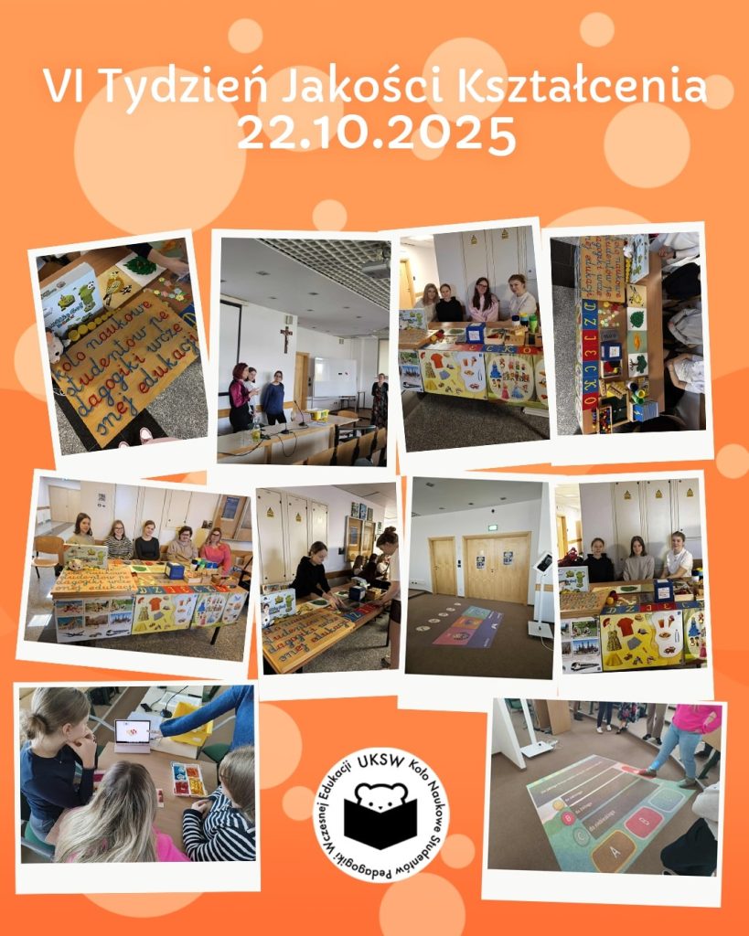 22 października Koło Naukowe Studentów Pedagogiki Wczesnej Edukacji, wzięło udział w IV Tygodniu Jakości Kształcenia. Podczas wydarzenia odwiedzający stoisko Koła, mogli dowiedzieć się więcej o jego działalności, inicjatywach i projektach, a także porozmawiać z członkami o możliwościach rozwoju naukowego. Dodatkowo przedstawicielki Koła przy wsparciu opiekunek przeprowadziły warsztaty pt.: ,,Innowacje technologiczne w pracy nauczyciela”. Uczestnicy mieli okazję zapoznać się z praktycznymi przykładami wykorzystania nowoczesnych narzędzi edukacyjnych, takich jak robot Photon, zestawy LEGO Education, czy interaktywna podłoga FlySky.