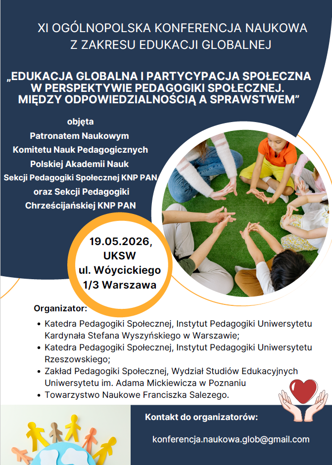 Wydział Nauk Pedagogicznych Uniwersytetu Kardynała Stefana Wyszyńskiego w Warszawie ma zaszczyt zaprosić do udziału w XI Ogólnopolskiej Konferencji Naukowej poświęconej problematyce edukacji globalnej oraz partycypacji społecznej w perspektywie pedagogiki społecznej.